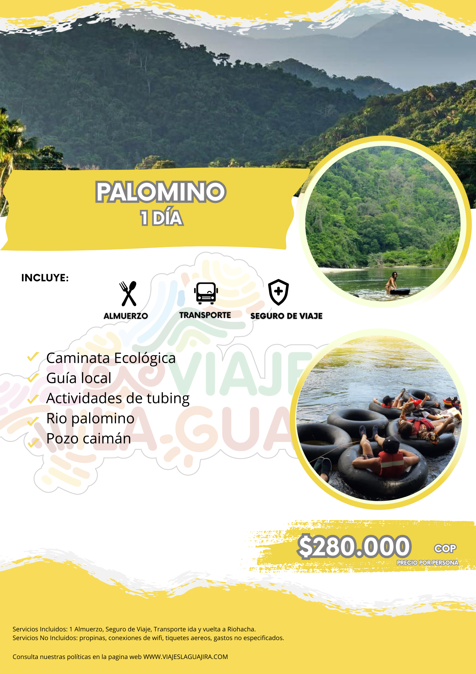 Caminata ecoturistica, guía local, actividades de tubing, almuerzos, Seguro de Viaje, Transporte ida y vuelta a Riohacha.
