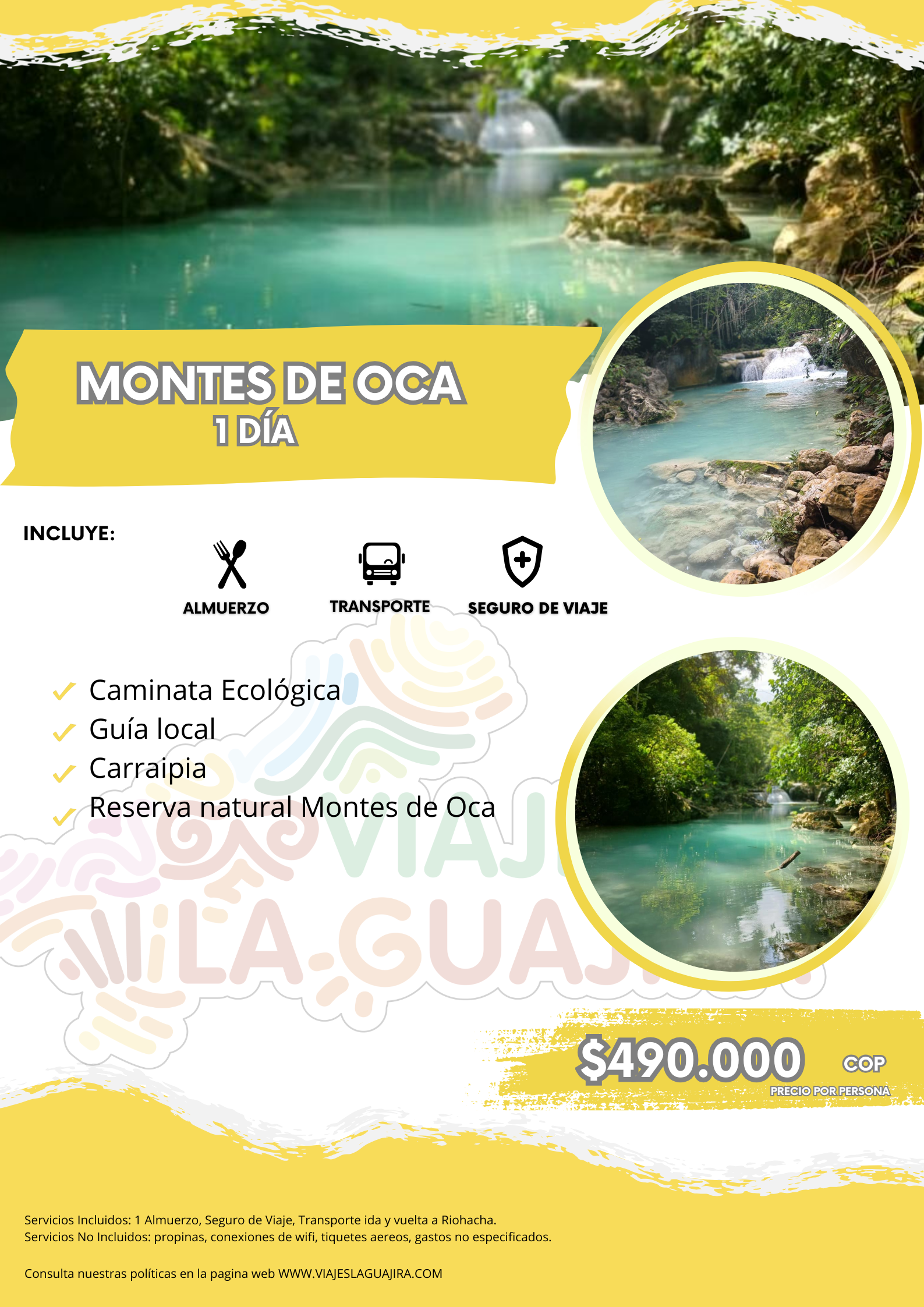 Caminata ecológica por la reserva forestal para avistamiento de flora y fauna de los Montes de Oca, visita a las majestuosas cascadas y pozos con aguas cristalinas que forman un color azul fascinante, incluye almuerzo, Seguro de Viaje, Transporte ida y vuelta a Riohacha.