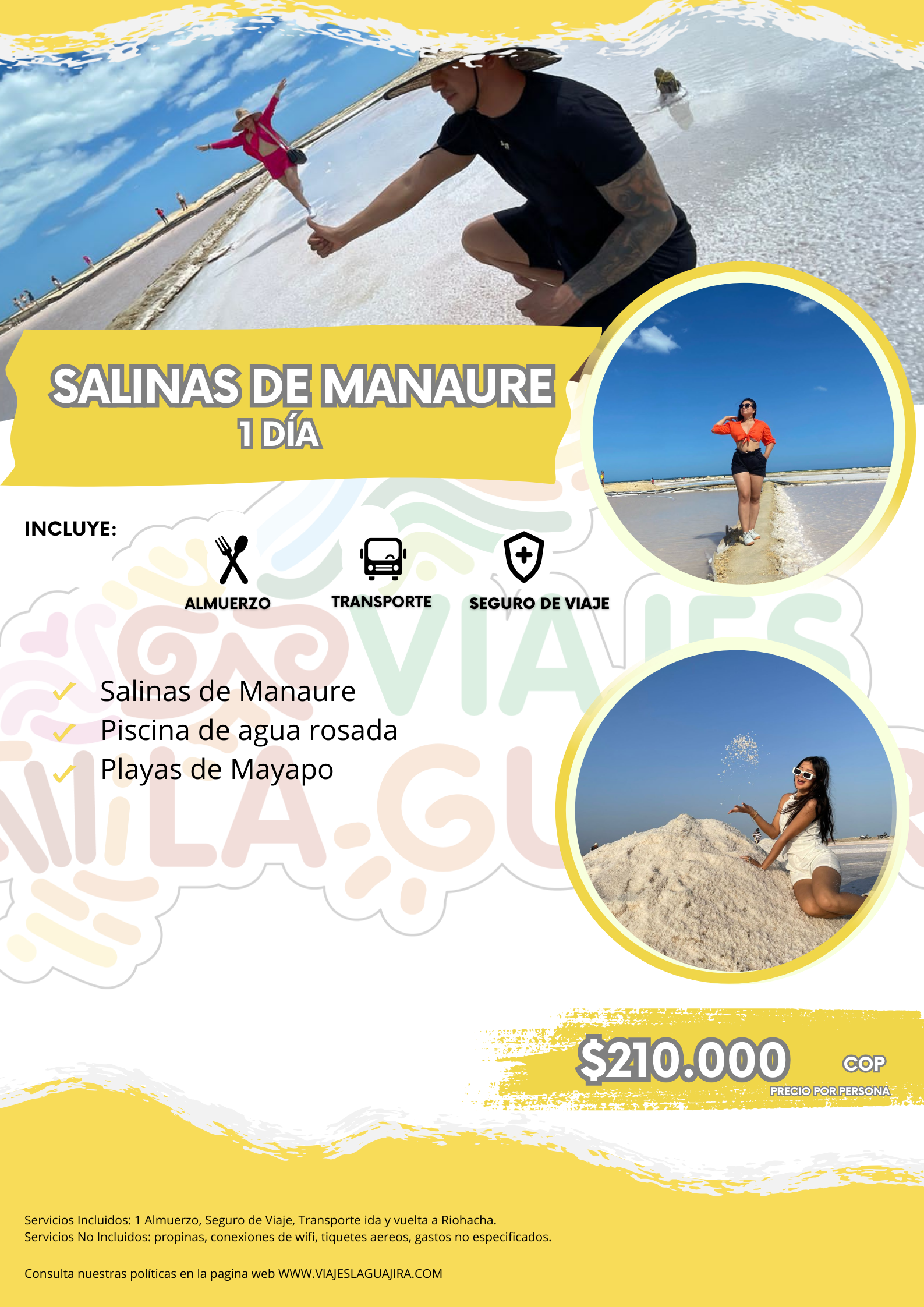 Visita las Playas de Mayapo, visita a las Salinas de Manaure donde se encuentran montañas de sal, visita a las piscinas de agua rosada, Incluye Almuerzos, Seguro de Viaje, Transporte ida y vuelta a Riohacha.