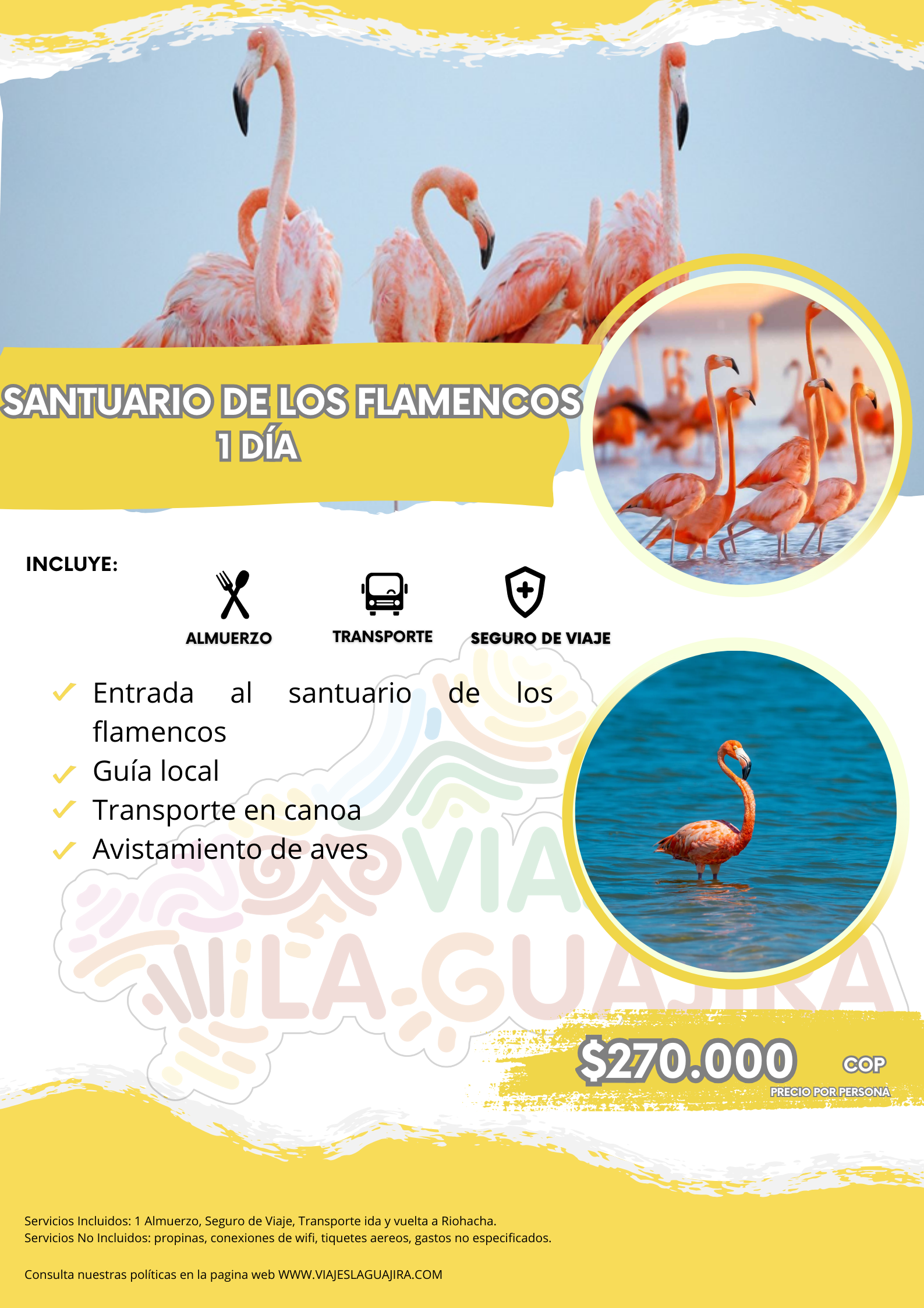 Entrada al santuario de los flamencos, guía local, transporte en cayuco (canoa) por la laguna para el avistamiento de aves, almuerzo, Seguro de Viaje, Transporte ida y vuelta a Riohacha.